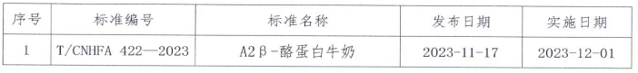 中國營養(yǎng)保健食品協(xié)會批準(zhǔn)發(fā)布《A2 β-酪蛋白牛奶》團體標(biāo)準(zhǔn)(T/CNHFA 422—2023),現(xiàn)予公告,自2023年12月1日起實施。