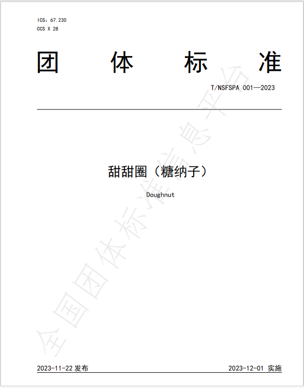根據(jù)《廣州市南沙區(qū)食品安全促進(jìn)會(huì)團(tuán)體標(biāo)準(zhǔn)管理辦法》 及有關(guān)的文件,批準(zhǔn)發(fā)布 T/NSFSPA 001-2023《甜甜圈》(糖 納子)團(tuán)體標(biāo)準(zhǔn),發(fā)布日期為 2023 年 11 月 22 日,實(shí)施日期 為 2023 年 12 月 1 日。 現(xiàn)予以公布。