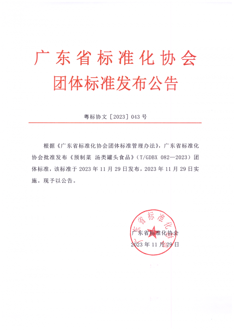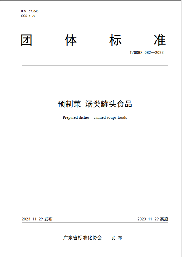 根據(jù)《廣東省標(biāo)準(zhǔn)化協(xié)會(huì)團(tuán)體標(biāo)準(zhǔn)管理辦法》,廣東省標(biāo)準(zhǔn)化協(xié)會(huì)批準(zhǔn)發(fā)布由廣東省科學(xué)院江門產(chǎn)業(yè)技術(shù)研究院有限公司主導(dǎo)制定的《預(yù)制菜 湯類罐頭食品》(T/GDBX 082—2023)團(tuán)體標(biāo)準(zhǔn),該標(biāo)準(zhǔn)于2023年11月29日發(fā)布,2023年11月29日實(shí)施。現(xiàn)予以公告。