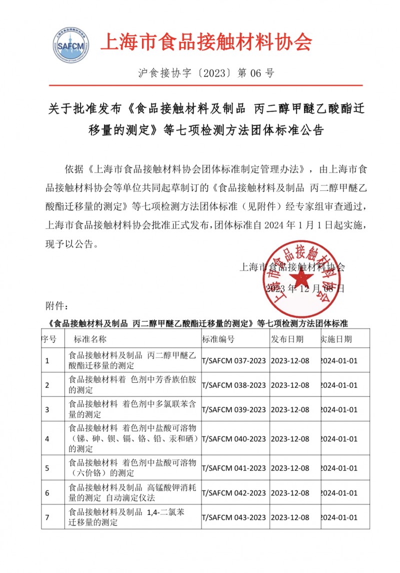 關于批準發(fā)布《食品接觸材料及制品 丙二醇甲醚乙酸酯遷移量的測定》等七項檢測方法團體標準公告.pdf