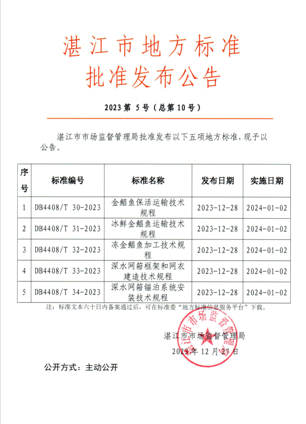 DB4408/T 30-2023 金鯧魚保活運輸技術規程 DB4408/T 31-2023 冰鮮金鯧魚運輸技術規程 DB4408/T 32-2023 凍金鯧魚加工技術規程