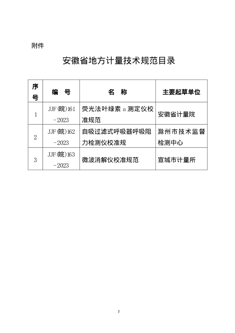 JJF(皖) 161-2023 熒光法葉綠素a測定儀校準規范 JJF(皖) 162-2023 自吸過濾式呼吸器呼吸阻力檢測儀校準規 JJF(皖) 163-2023 微波消解儀校準規范