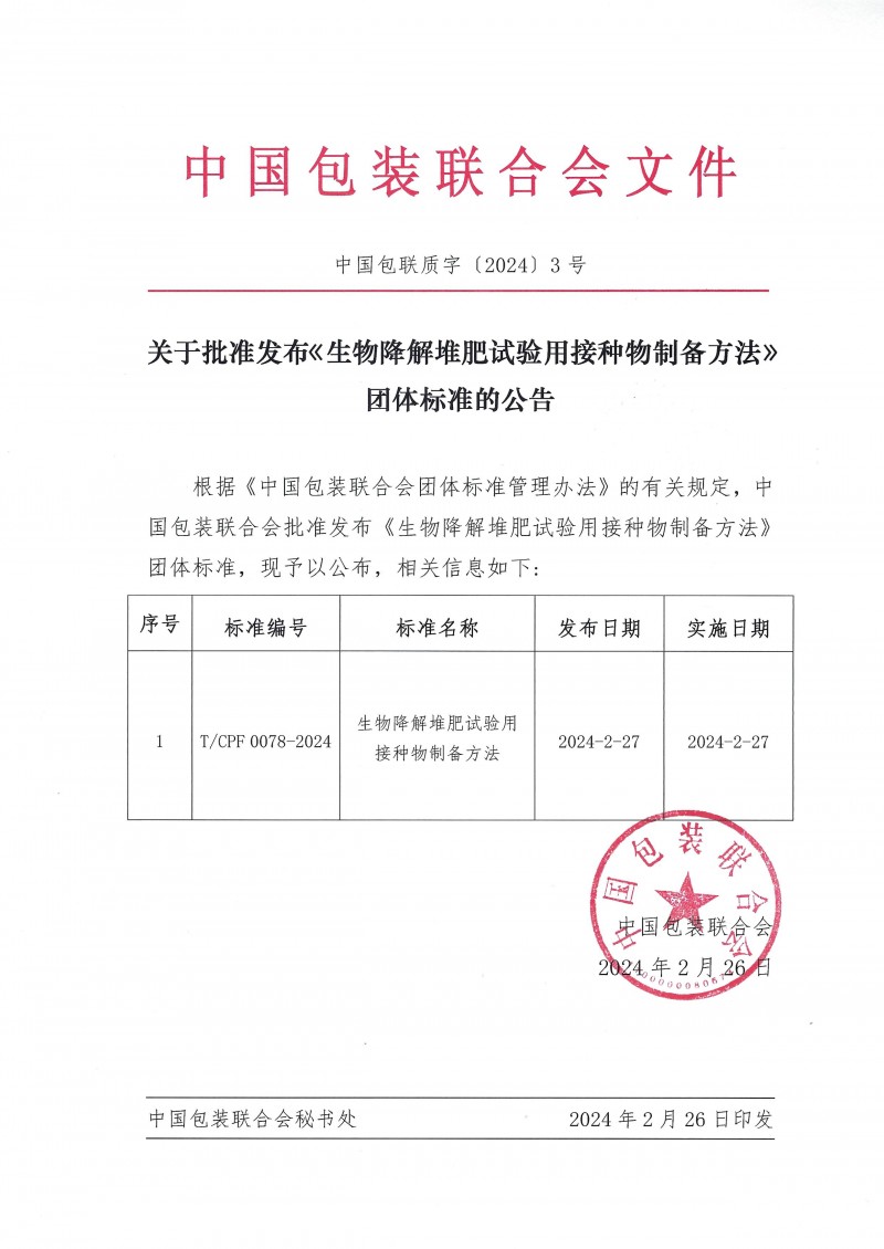 以上為中國包裝聯合會關于批準發布《生物降解堆肥試驗用接種物制備方法》團體標準的公告(中國包聯質字[2024]3號)的檢測服務介紹,如有其他疑問可聯系在線工程師!