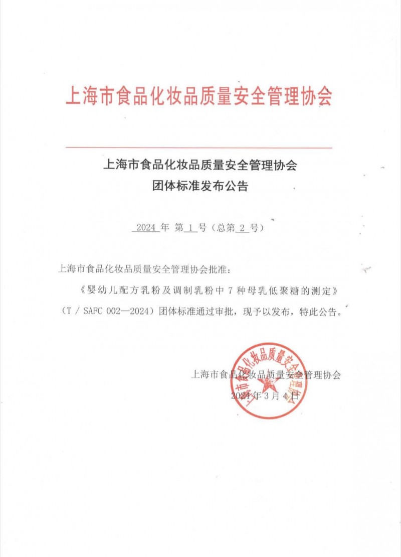 上海市食化協會團體標準發布公告2024年第1號(總第2號)|《嬰幼兒配方乳粉及調制乳粉中7種母乳低聚糖的測定》