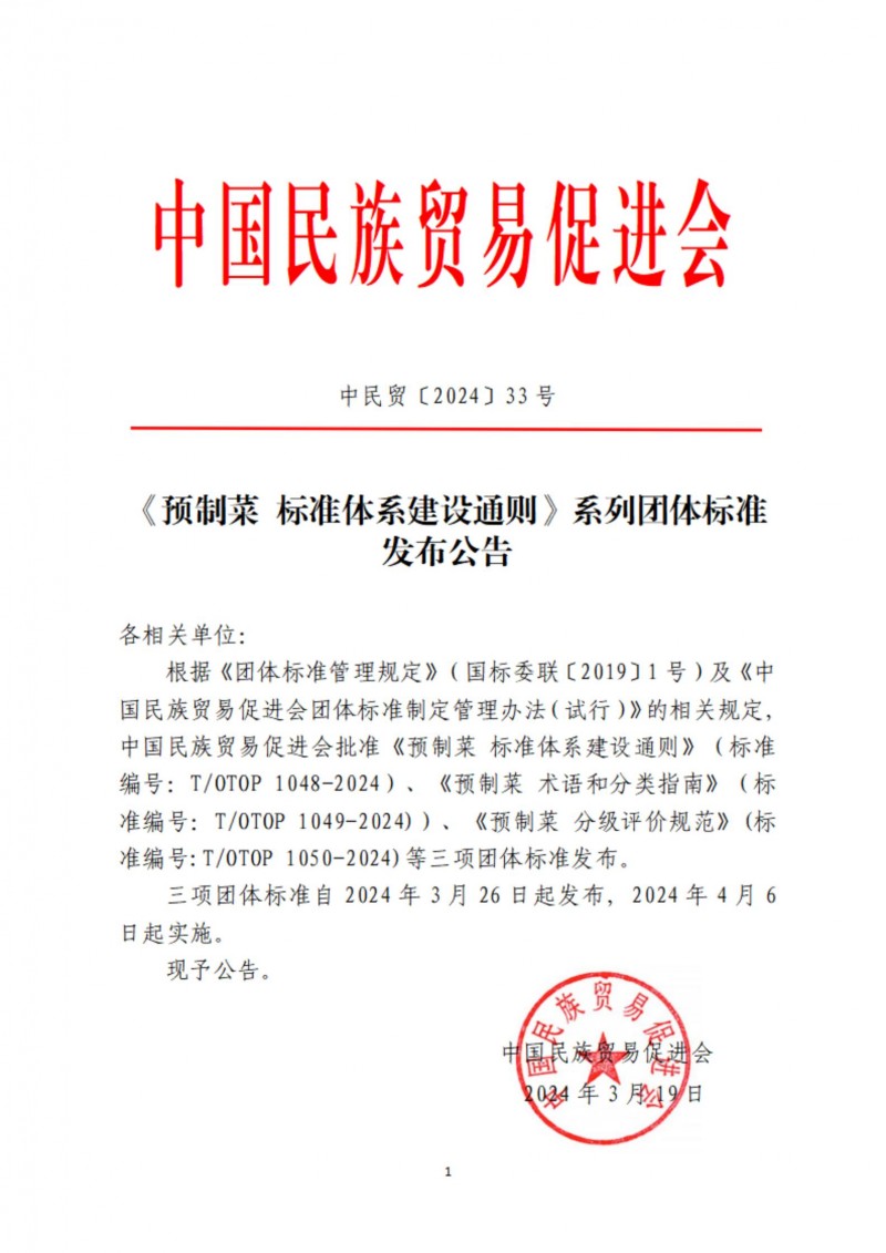 根據《團體標準管理規定》(國標委聯〔2019〕1號)及《中 國民族貿易促進會團體標準制定管理辦法(試行)》的相關規定,中國民族貿易促進會批準《預制菜標準體系建設通則》(標準編號:T/OTOP1048-2024)、《預制菜術語和分類指南》(標準編號:T/OTOP 1049-2024)、《預制菜分級評價規范》(標準編號:T/OTOP1050-2024)等三項團體標準發布。