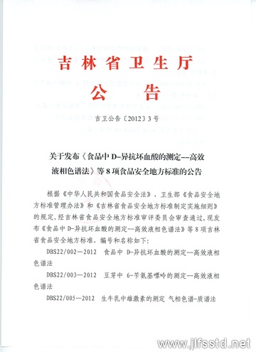 以上為吉林省衛生廳發于發布《食品中D-異抗壞血酸的測定 高效液相色譜法》等8項食品安全地方標準的公告 吉衛公告〔2012〕3號的檢測服務介紹,如有其他疑問可聯系在線工程師!