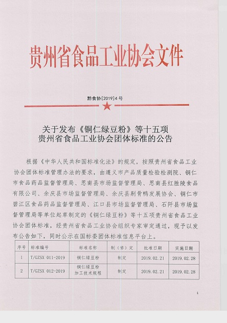 | 1 | T/GZSX 011-2019 | 銅仁綠豆粉 | 制定 | 2019.02.21 | 2019.02.28 |
