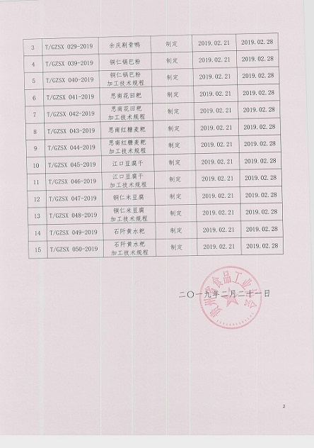 | 11 | T/GZSX 046-2019 | 江口豆腐干加工技術規程 | 制定 | 2019.02.21 | 2019.02.28 |