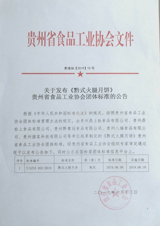 | 1 | T/GZSX 052-2019 | 黔式火腿月餅 | 制定 | 2019.06.08 | 2019.06.18 |