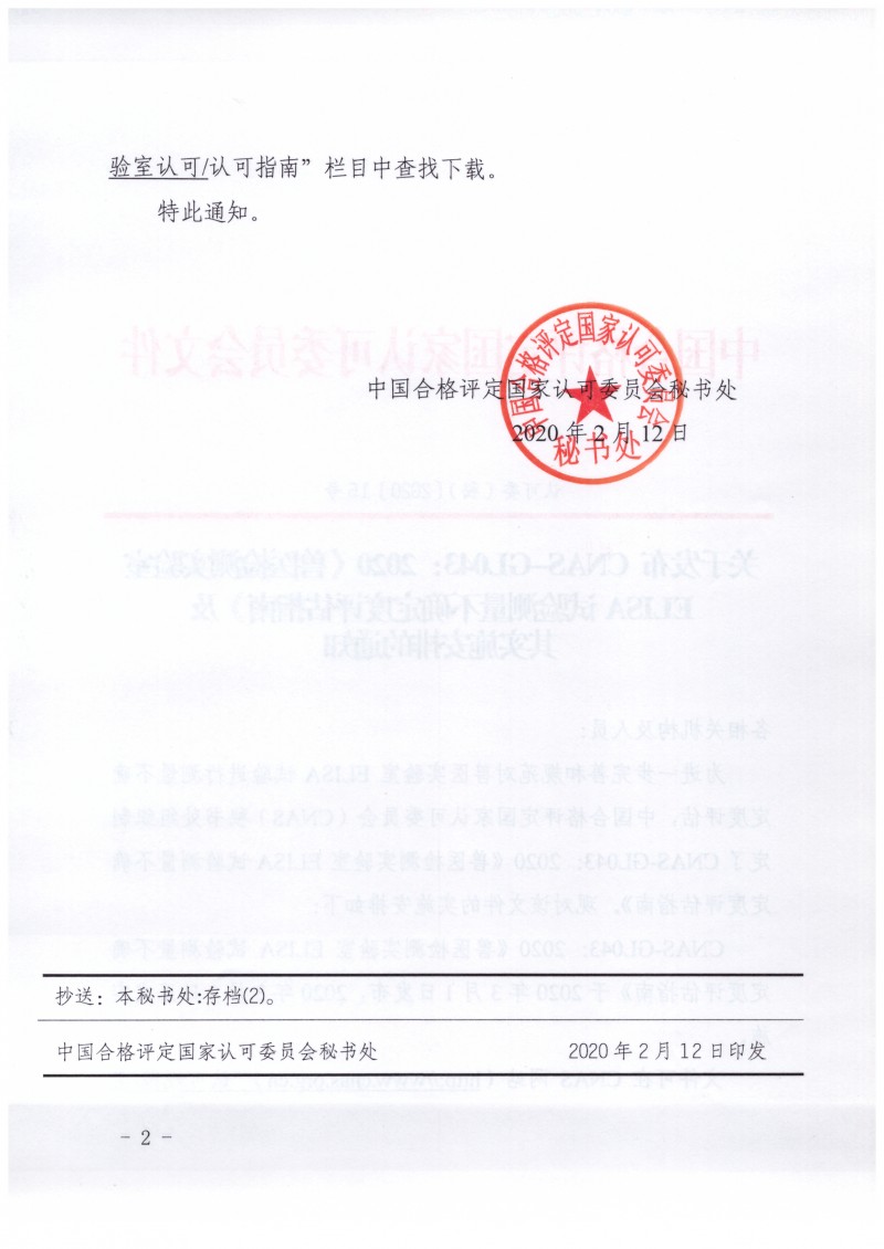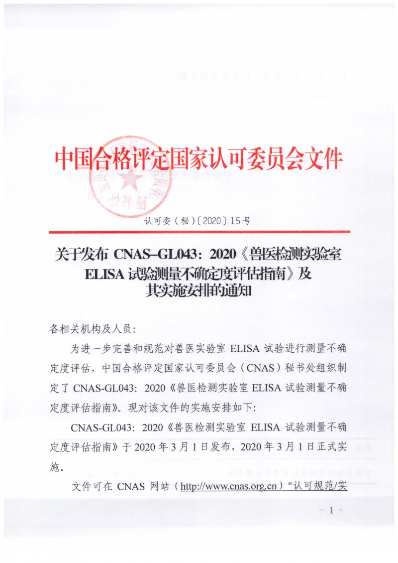 以上為中國合格評定國家認可委員會關于發布CNAS-GL043:2020《獸醫檢測實驗室ELISA試驗測量不確定度評估指南》及其實施安排的通知(認可委(秘)〔2020〕15號)的檢測服務介紹,如有其他疑問可聯系在線工程師!