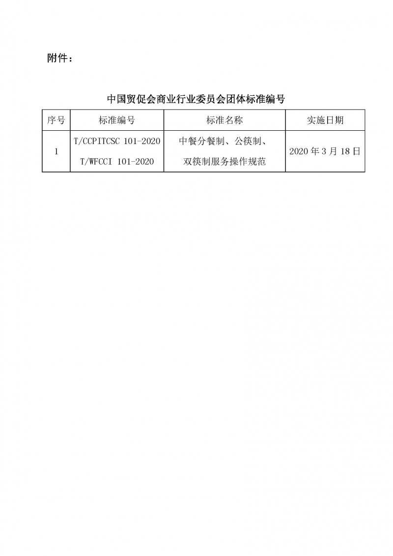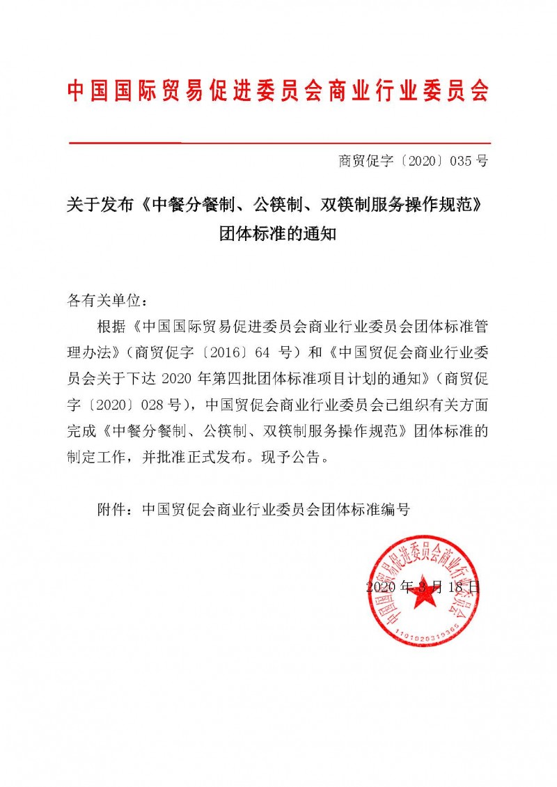 中國貿(mào)促會商業(yè)行業(yè)委員會關(guān)于發(fā)布《中餐分餐制、公筷制、雙筷制服務(wù)操作規(guī)范》 團(tuán)體標(biāo)準(zhǔn)的通知(商貿(mào)促字〔2020〕035 號)