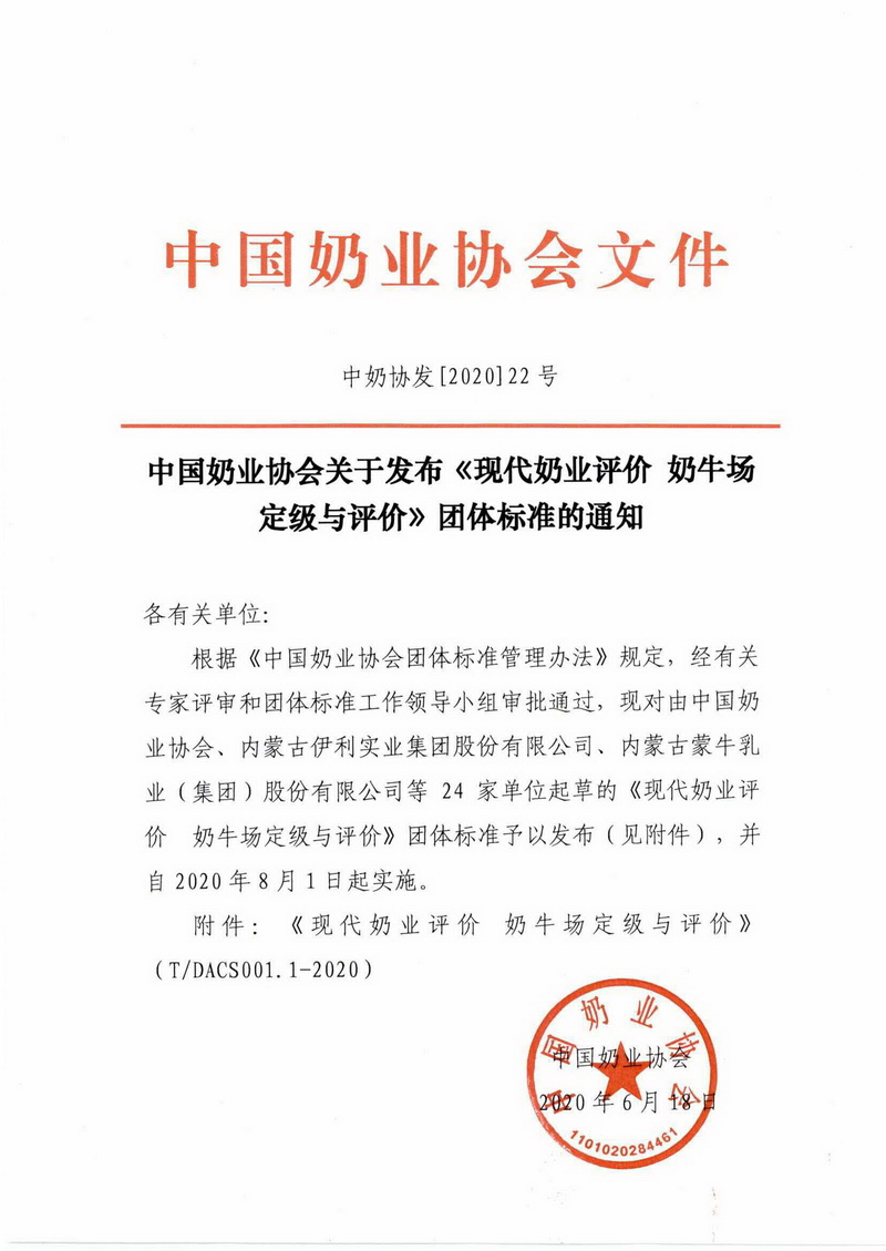 中奶協發布《現代奶業評價 奶牛場定級與評價》團體標準(中奶協發[2020]22號)