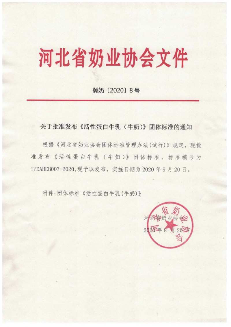 河北省奶業協會關于批準發布《活性蛋白牛乳(牛奶)》團體標準的通知(冀奶〔2020〕8號)