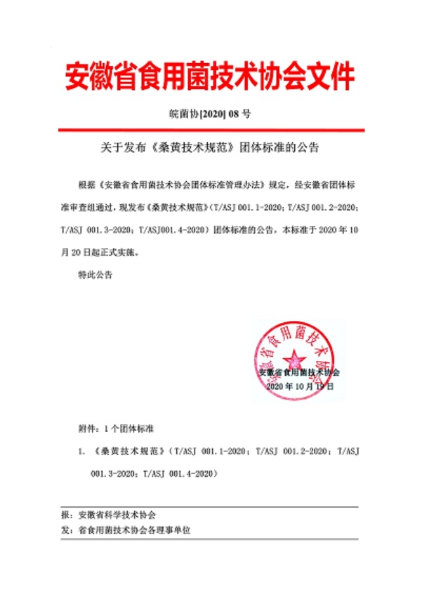 發(fā)布的團體標準包括: T/ASJ 001.1-2020《桑黃技術(shù)規(guī)范 第1部分:桑黃菌種制作技術(shù)規(guī)范》 T/ASJ 001.2-2020《桑黃技術(shù)規(guī)范 第2部分:桑黃菌段制作技術(shù)規(guī)范》 T/ASJ 001.3-2020《桑黃技術(shù)規(guī)范 第3部分:桑黃栽培技術(shù)規(guī)范》 T/ASJ 001.4-2020《桑黃技術(shù)規(guī)范 第4部分:桑黃子實體質(zhì)量要求》