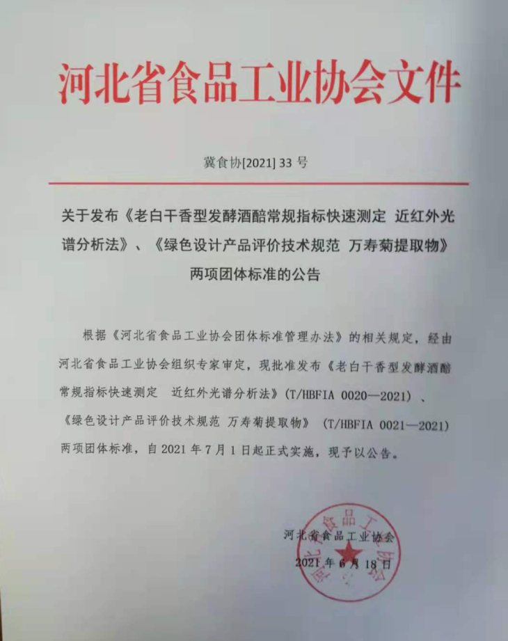 T/HBFIA 0020-2021 老白干香型發酵酒醅常規指標快速測定 近紅外光譜分析法 T/HBFIA 0021-2021 綠色設計產品評價技術規范 萬壽菊提取物