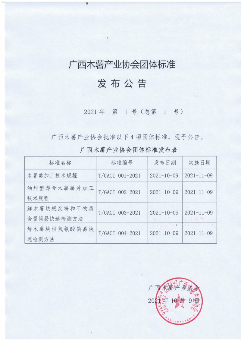 | 鮮木薯塊根淀粉和干物質(zhì)含量簡易快速檢測方法 | T/GACI 003-2021 | 2021-10-09 | 2021-11-09 |
