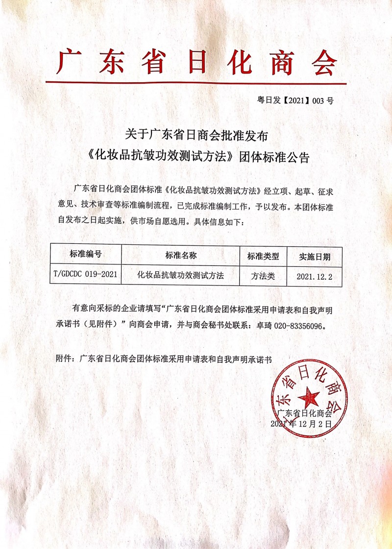 以上為關于廣東省日商會批準發布《化妝品抗皺功效測試方法》團體標準公告(粵日發【2021】003號)的檢測服務介紹,如有其他疑問可聯系在線工程師!