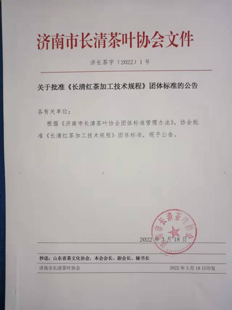 2022年3月18日,濟南市長清茶葉協(xié)會會長辦公會研究確定,根據(jù)《濟南市長清茶葉協(xié)會團體標(biāo)準(zhǔn)管理辦法》,批準(zhǔn)《長清紅茶加工技術(shù)規(guī)程》團體標(biāo)準(zhǔn),準(zhǔn)予發(fā)布。