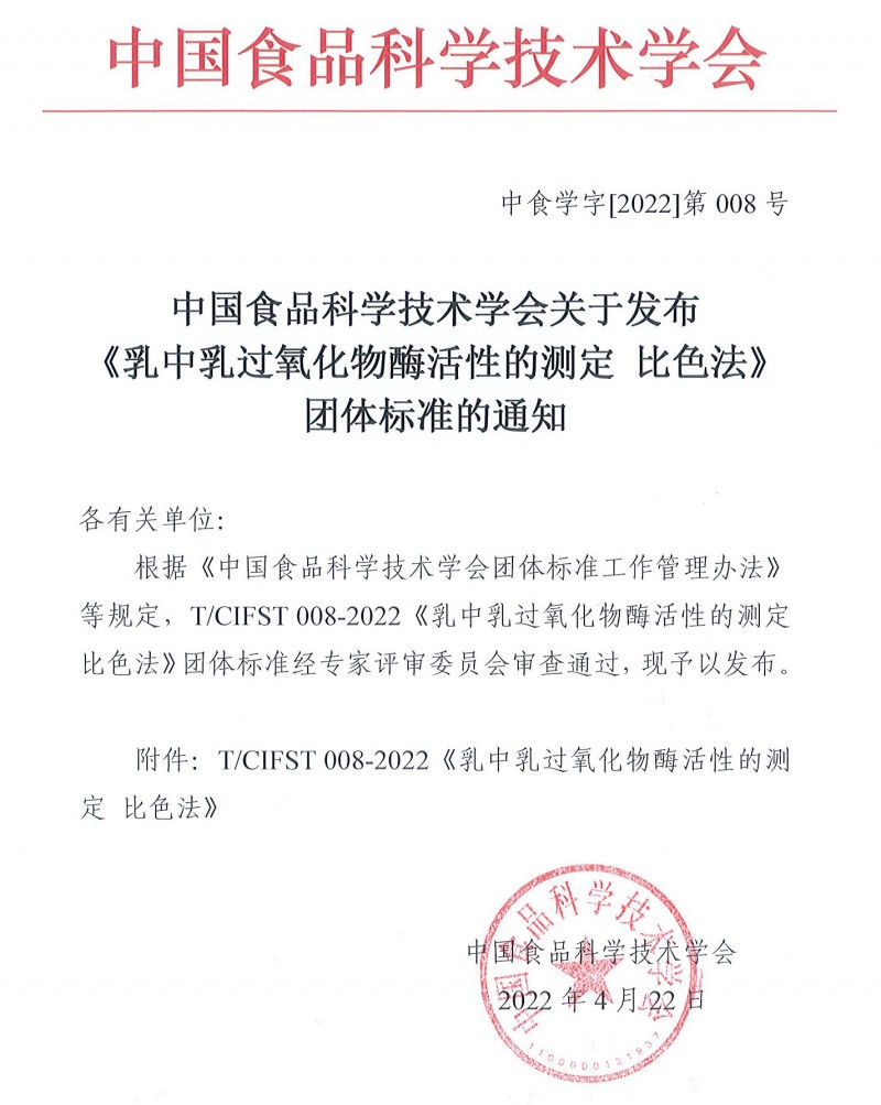 以上為中國食品科學技術學會關于發布《乳中乳過氧化物酶活性的測定 比色法》團體標準的通知(中食學字[2022]第008號)的檢測服務介紹,如有其他疑問可聯系在線工程師!