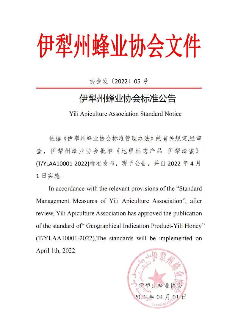 依據(jù)《伊犁州蜂業(yè)協(xié)會(huì)標(biāo)準(zhǔn)管理辦法》的有關(guān)規(guī)定,經(jīng)審查,伊犁州蜂業(yè)協(xié)會(huì)批準(zhǔn)《地理標(biāo)志產(chǎn)品伊犁蜂蜜》(T/YLAA10001-2022)標(biāo)準(zhǔn)發(fā)布,現(xiàn)予公告,并自2022年4月1日實(shí)施。