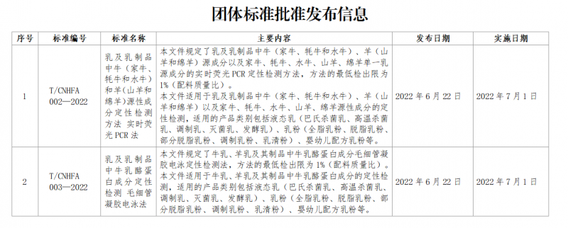 中國營養(yǎng)保健食品協(xié)會批準發(fā)布《乳及乳制品中牛(家牛、牦牛和水牛)和羊(山羊和綿羊)源性成分定性檢測方法 實時熒光PCR法》(T/CNHFA 002-2022)團體標準和《乳及乳制品中牛乳酪蛋白成分定性檢測 毛細管凝膠電泳法》(T/CNHFA 003-2022)團體標準,現(xiàn)予公告,自2022年7月1日起實施。