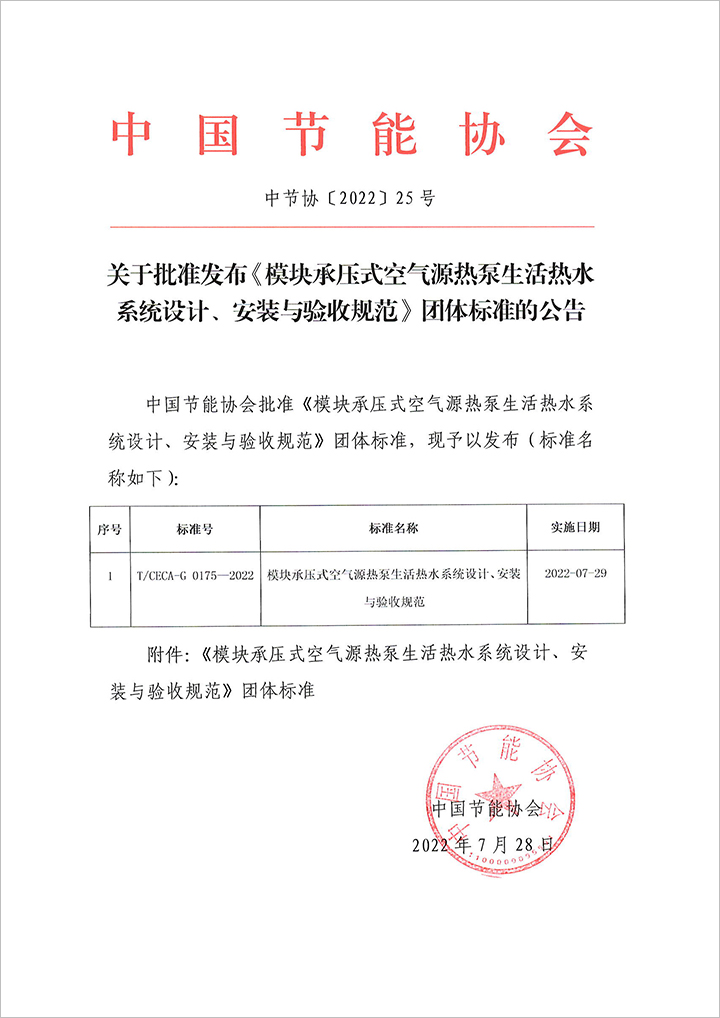 以上為中國節能協會關于批準發布《模塊承壓式空氣源熱泵生活熱水系統設計、安裝與驗收規范》團體標準的公告(中節協〔2022〕25號)的檢測服務介紹,如有其他疑問可聯系在線工程師!