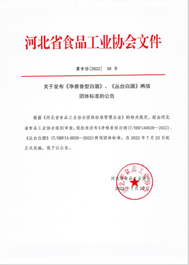 T/HBFIA 0028-2022 凈雅香型白酒 T/HBFIA 0029-2022 叢臺白酒