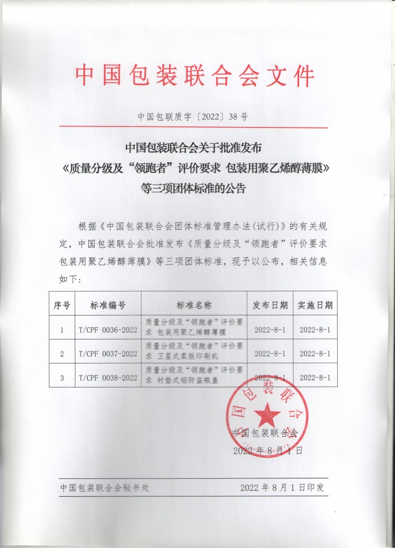 T/CPF 0036-2022 質量分級及“領跑者”評價要求 包裝用聚乙烯醇薄膜 T/CPF 0038-2022 質量分級及“領跑者”評價要求 襯墊式鋁防盜瓶蓋