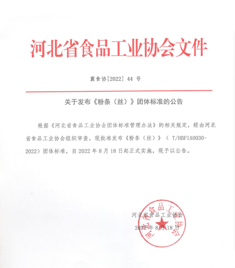 根據《河北省食品工業(yè)協(xié)會團體標準管理辦法》的相關規(guī)定,經由河北省食品工業(yè)協(xié)會組織審查,現批準發(fā)布《粉條(絲)》(T/HBFIA 0030-2022)團體標準,自2022年8月18日起正式實施,現予以公告。