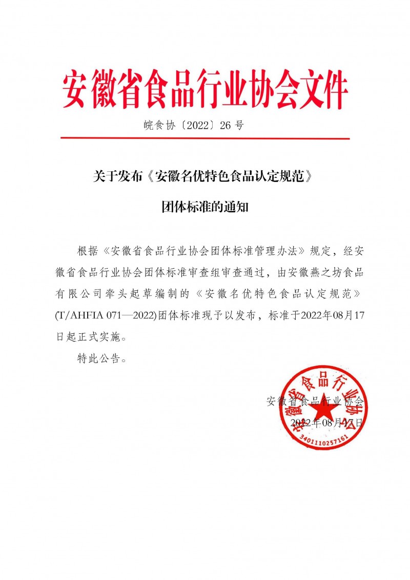 以上為安徽省食品行業協會關于發布《安徽名優特色食品認定規范》 團體標準的通知(皖食協[2022]26號)的檢測服務介紹,如有其他疑問可聯系在線工程師!