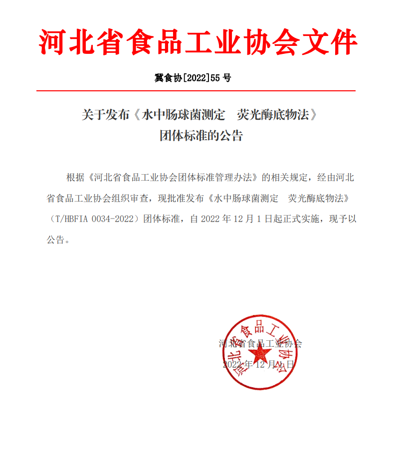 以上為河北省食品工業協會關于發布《水中腸球菌測定 熒光酶底物法》團體標準的公告(冀食協[2022]55號)的檢測服務介紹,如有其他疑問可聯系在線工程師!
