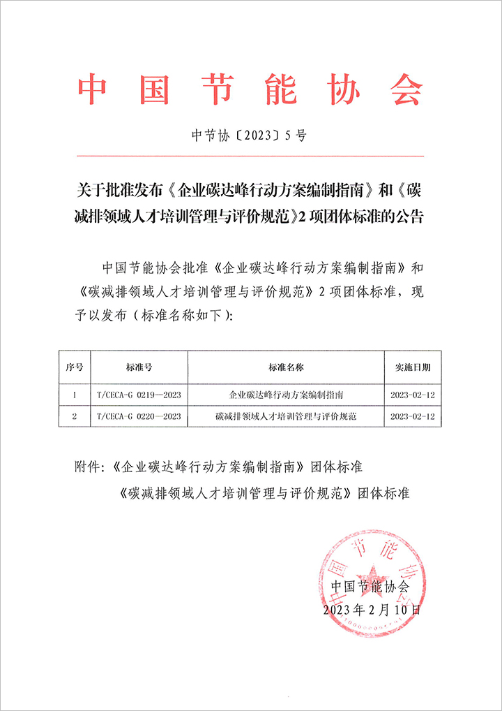 關(guān)于批準發(fā)布《企業(yè)碳達峰行動方案編制指南》和《碳減排領(lǐng)域人才培訓管理與評價規(guī)范》2項團體標準的公告.PDF