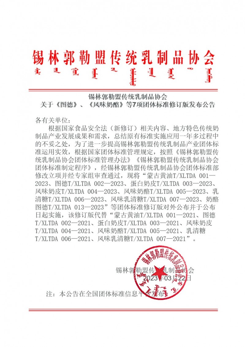 T/XLTDA 001-2023 蒙古黃油 T/XLTDA 002-2023 圖德 T/XLTDA 003-2023 蛋白奶皮 T/XLTDA 004-2023 風味奶皮 T/XLTDA 005-2023 風味奶酪 T/XLTDA 006-2023 乳清糖 T/XLTDA 007-2023 風味乳清糖 T/XLTDA 013-2023 奶酪圖德