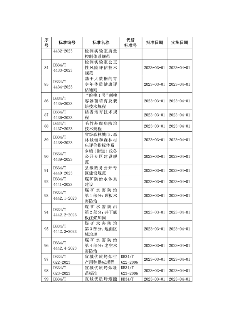 | DB34/T 4432-2023 | 食用農產品快速檢測實驗室質量控制體系規范 | 2023-03-01 | 2023-04-01 | |