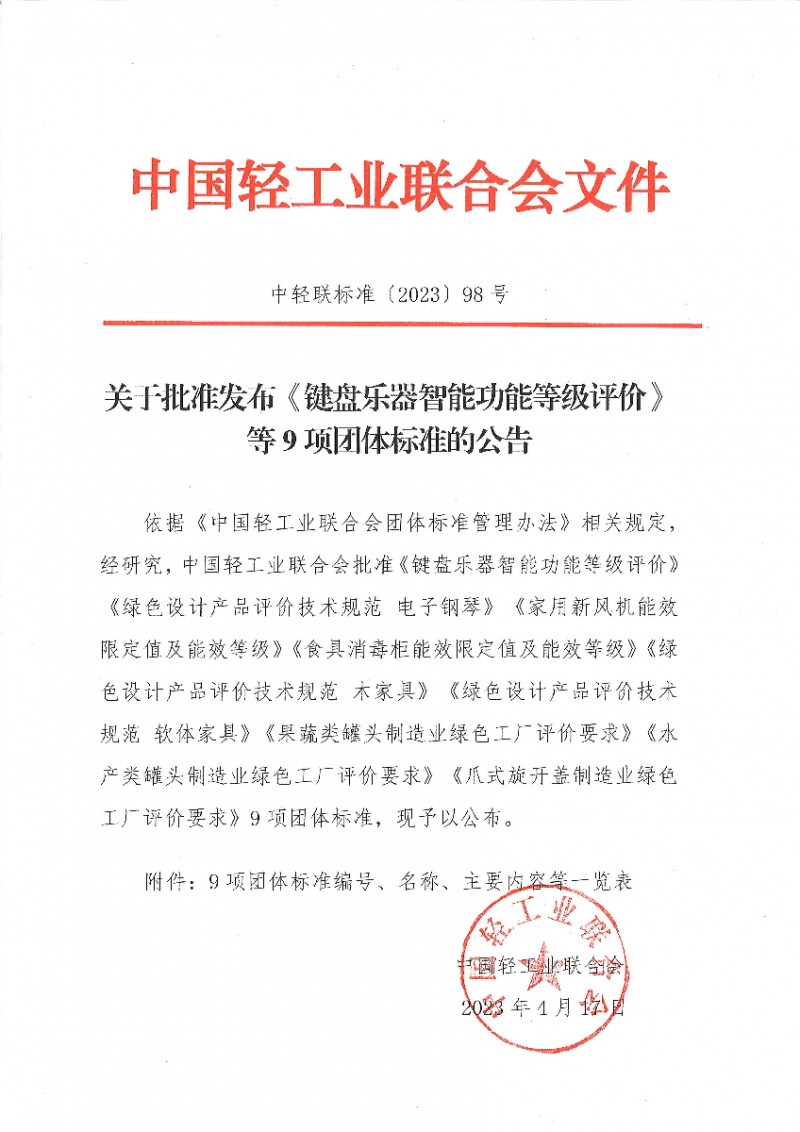 以上為中國輕工業(yè)聯(lián)合會(huì)關(guān)于批準(zhǔn)發(fā)布《鍵盤樂器智能功能等級(jí)評(píng)價(jià)》等9項(xiàng)團(tuán)體標(biāo)準(zhǔn)的公告(中輕聯(lián)標(biāo)準(zhǔn)[2023]98號(hào))的檢測服務(wù)介紹,如有其他疑問可聯(lián)系在線工程師!