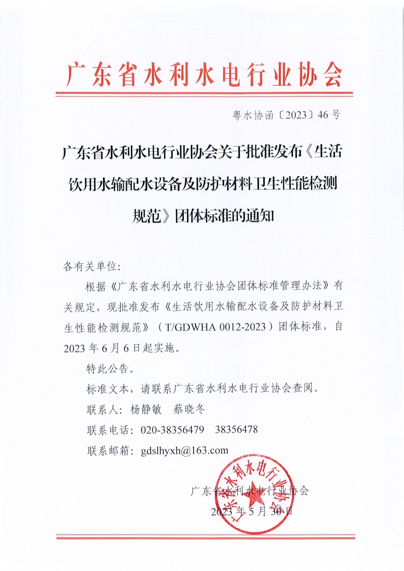 以上為廣東省水利水電行業(yè)協(xié)會關(guān)于批準(zhǔn)發(fā)布《生活飲用水輸配水設(shè)備及防護材料衛(wèi)生性能檢測規(guī)范》團體標(biāo)準(zhǔn)的通知(粵水協(xié)函〔2023〕46號)的檢測服務(wù)介紹,如有其他疑問可聯(lián)系在線工程師!