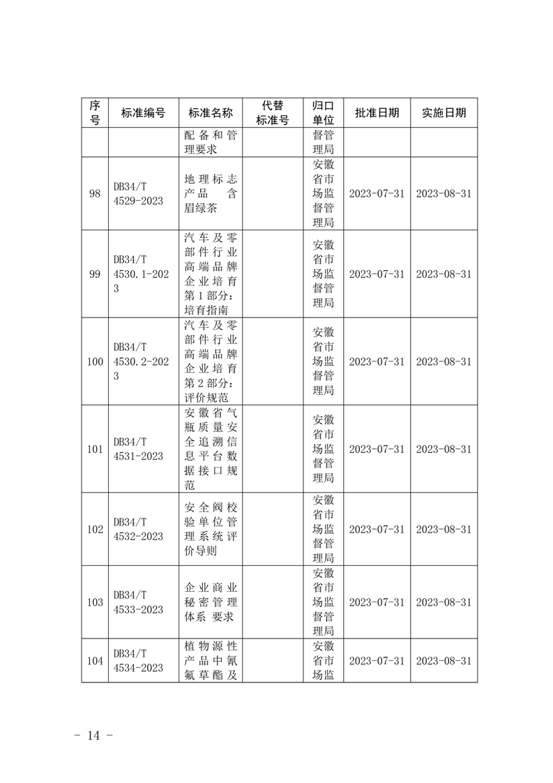 | DB34/T 4531-2023 | 安徽省氣瓶質(zhì)量安全追溯信息平臺(tái)數(shù)據(jù)接口規(guī)范 | 2023-07-31 | 2023-08-31 | |