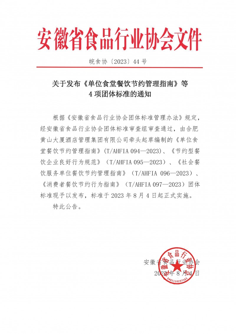 T/AHFIA 094-2023 單位食堂餐飲節(jié)約管理指南 T/AHFIA 095-2023 節(jié)約型餐飲企業(yè)良好行為規(guī)范 T/AHFIA 096-2023 社會餐飲服務(wù)單位餐飲節(jié)約管理指南 T/AHFIA 097-2023 消費者餐飲節(jié)約行為指南