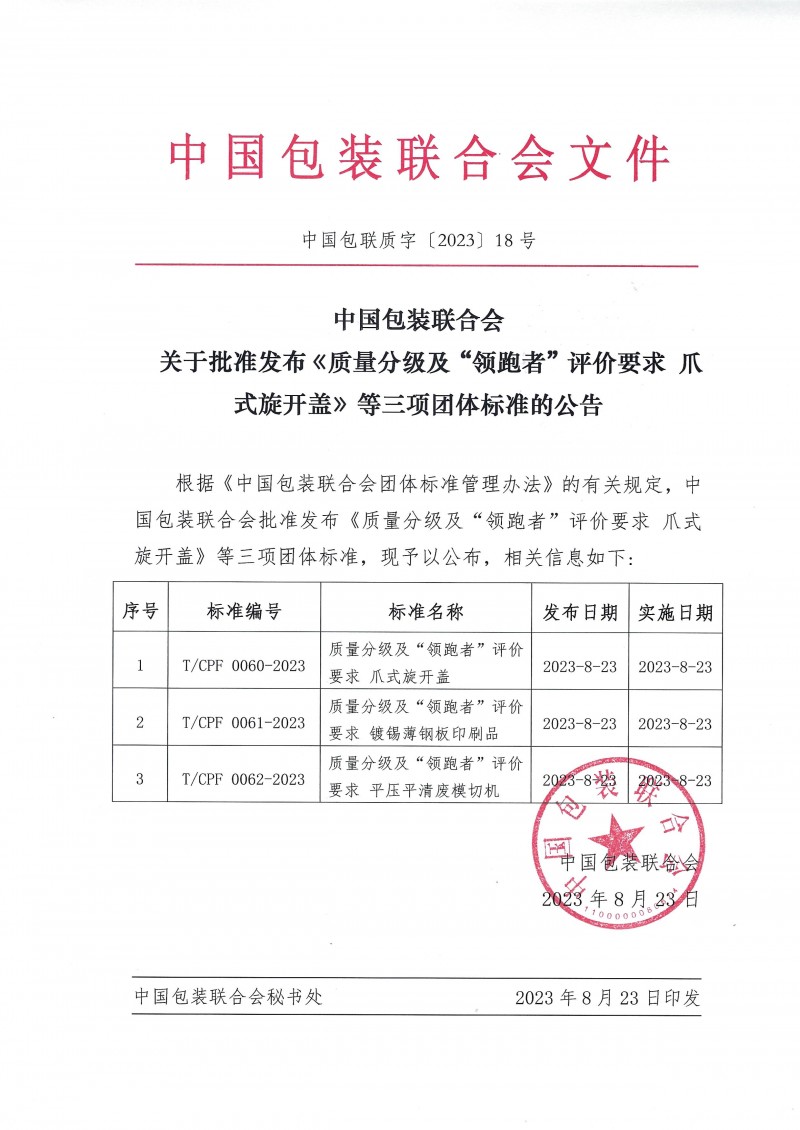 以上為中國包裝聯合會關于批準發布《質量分級及“領跑者”評價要求 爪式旋開蓋》等三項團體標準的公告(中國包聯質字[2023]18號)的檢測服務介紹,如有其他疑問可聯系在線工程師!