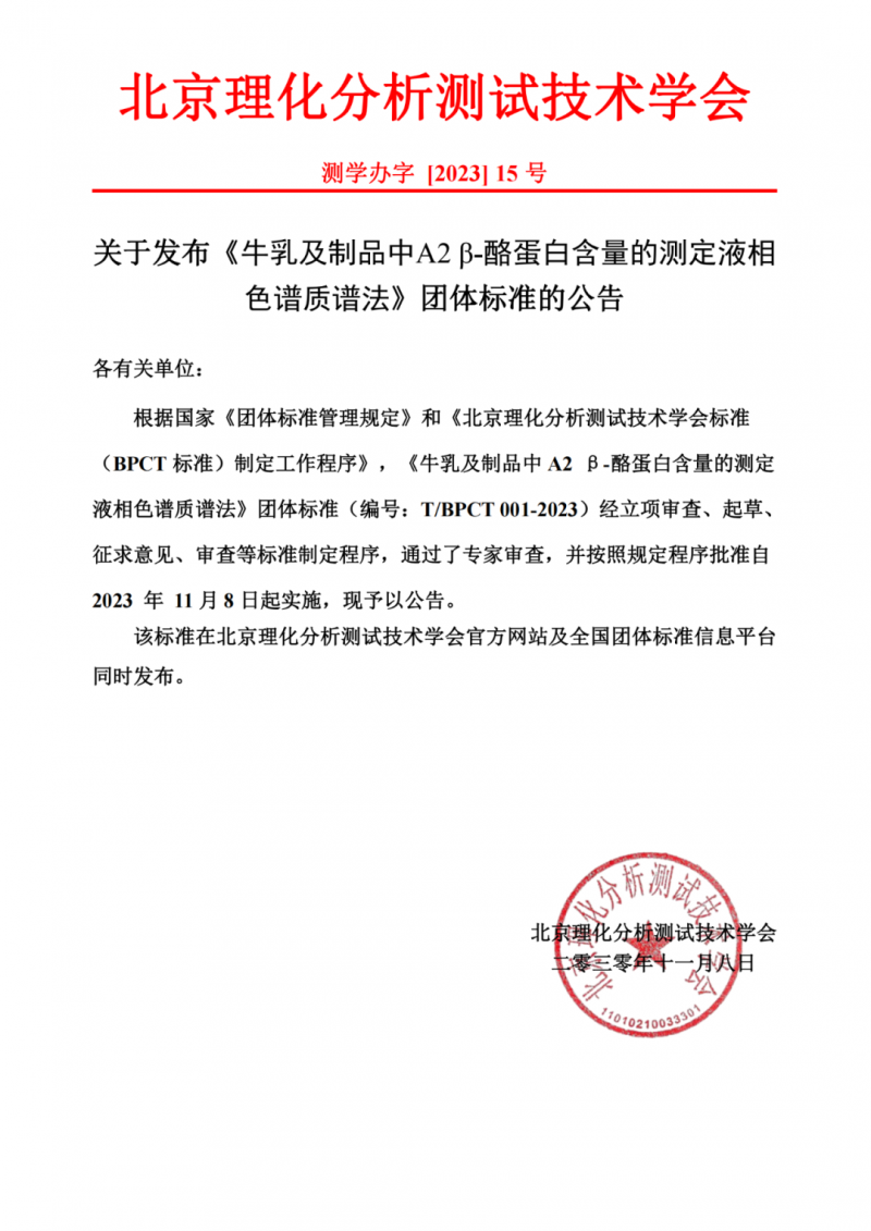 以上為北京理化分析測試技術學會關于發(fā)布《牛乳及制品中A2 β-酪蛋白含量的測定液相色譜質譜法》團體標準的公告(測學辦字[2023]15號)的檢測服務介紹,如有其他疑問可聯系在線工程師!