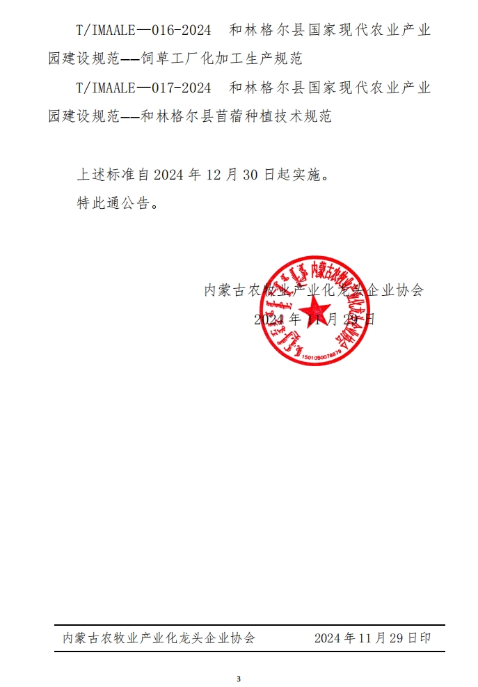 T/IMAALE 005-2024 和林格爾縣國家現代農業產業園建設規范-咸奶茶粉配方規范 T/IMAALE 006-2024 和林格爾縣國家現代農業產業園建設規范-咸奶茶粉加工工藝規程 T/IMAALE 007-2024 和林格爾縣國家現代農業產業園建設規范-原奶貯存和運輸規范 T/IMAALE 008-2024 和林格爾縣國家現代農業產業園建設規范-乳制品智能制造規程 T/IMAALE 009-2024 和林格爾縣國家現代農業產業園建設規范-凝固型酸奶制作規范 T/IMAALE 010-2024 和林格爾縣國家現代農業產業園建設規范-奶酪生產技術規范 T/IMAALE 011-2024 和林格爾縣國家現代農業產業園建設規范-奶牛飼料拌料配方規程 T/IMAALE 012-2024 和林格爾縣國家現代農業產業園建設規范-奶源溯源操作規程 T/IMAALE 013-2024 和林格爾縣國家現代農業產業園建設規范-乳及乳制品消費者服務規范 T/IMAALE 014-2024 和林格爾縣國家現代農業產業園建設規范-乳制品生產企業管理規范 T/IMAALE 015-2024 和林格爾縣國家現代農業產業園建設規范-青貯玉米等級規范 T/IMAALE 016-2024 和林格爾縣國家現代農業產業園建設規范-飼草工廠化加工生產規范